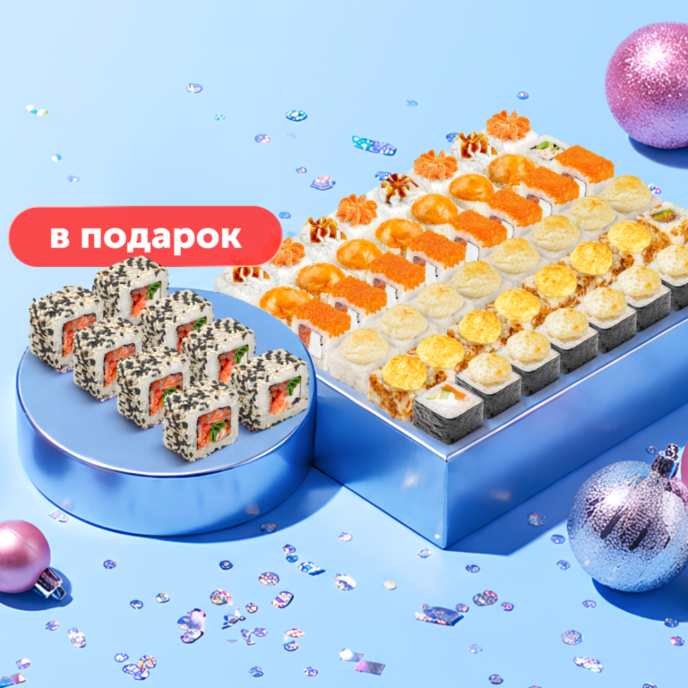 А теперь ещё круче: при покупке Новогоднего Чикуби — ролл «Яркий Лосось» в подарок!