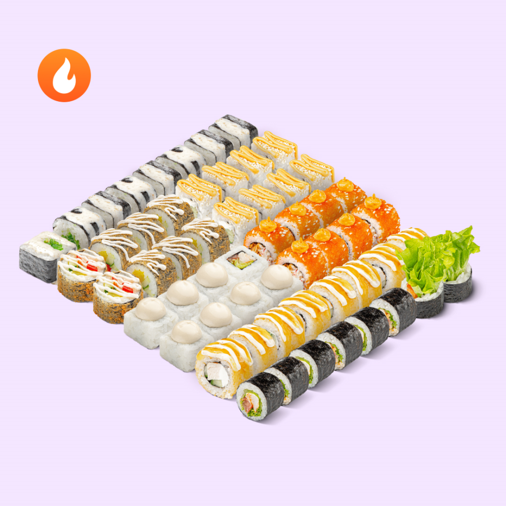 Ты знаешь что делать. Разминай щёки и заказывай большой сет с яркими азиатскими вкусами. Состав: Чукка ролл, Чикен том ям, Калифорния кранч том ям, Креветка 1000 островов, Курица чили-ананас, Цезарь, Яссай спайс с трюфельным соусом