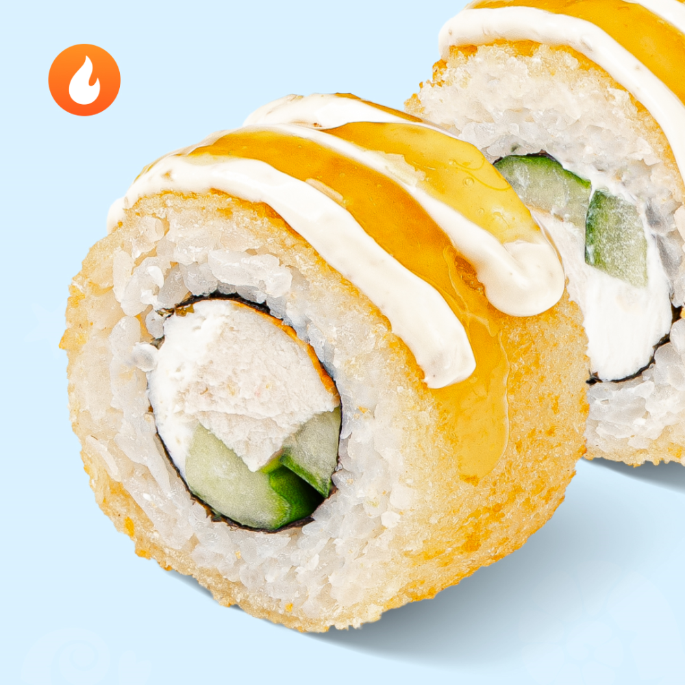 Эта цыпочка знает, как доставить удовольствие. Бери горячий ролл с ярким соусом чили-ананас. Состав: курица жареная, соус чили-ананас, соус цезарь, сыр сливочный, огурец, сухари панировка, кляр, рис, нори