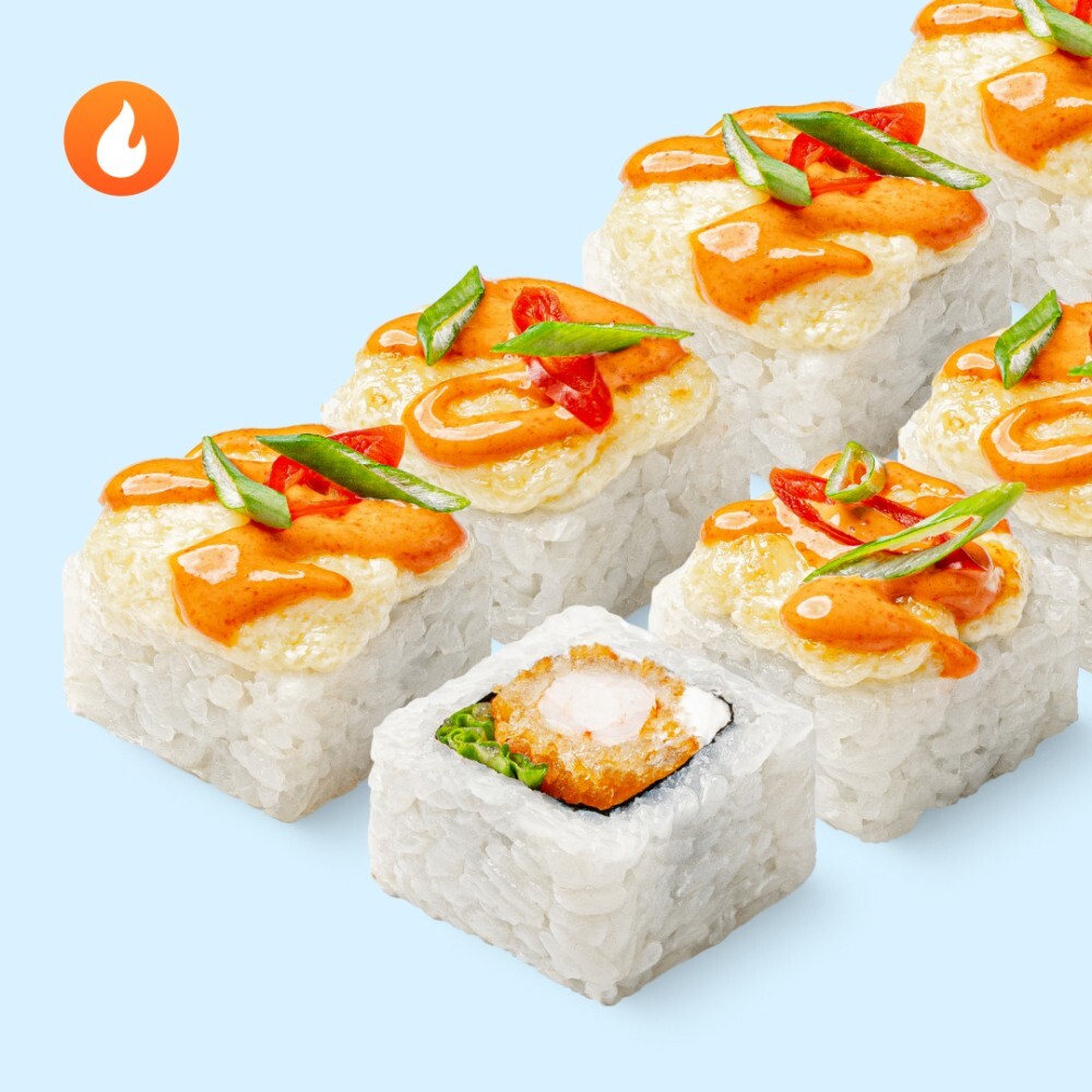 Рис, мицукан, сахар, соль, комбу, сыр сливочный, креветка, мука, яйцо, нори, салат, паста кимчи, лук зеленый, перец чили, майонез, сыр гауда